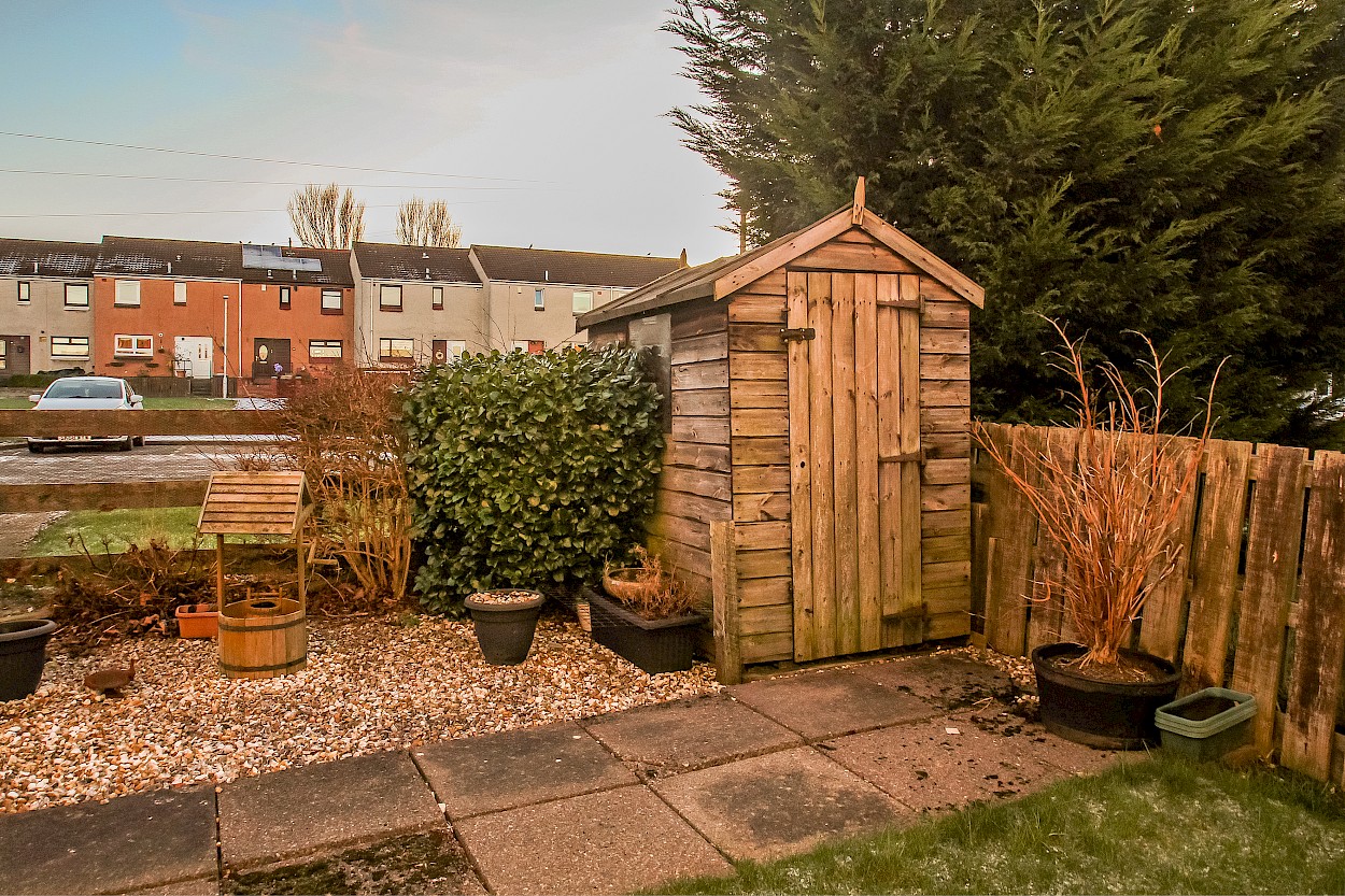 The neat gardens are mainly laid to lawn. There is a garden shed, patio area, gate to parking areas and a south facing aspect to rear.